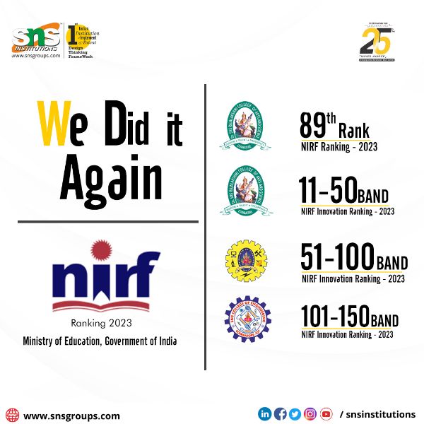 SNS was established in 1997 by SNS Charitable Trust with a high Mission and noble thought of educating the needy. Now, we offer 150+ courses covering both UG and PG programmes in the leading fields of Engineering, Technology, Arts, Pharmacy and Allied Health Sciences.