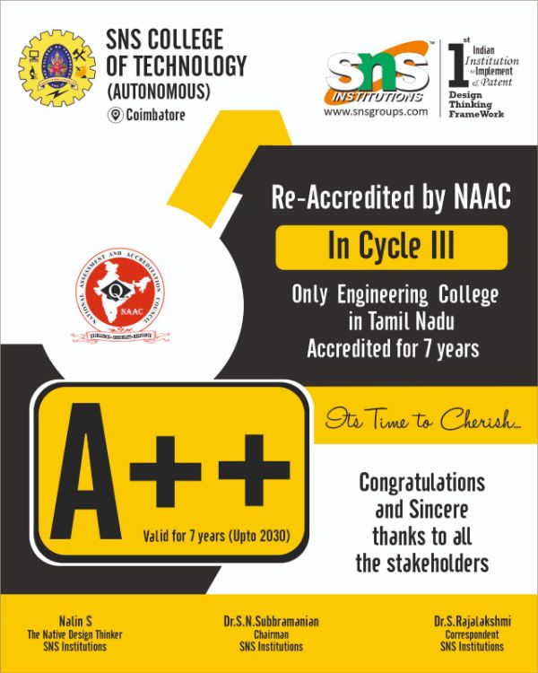 SNS College of Technology, Coimbatore, renowned for its excellence in teaching, learning and research in diversified fields of Engineering and Technology.
